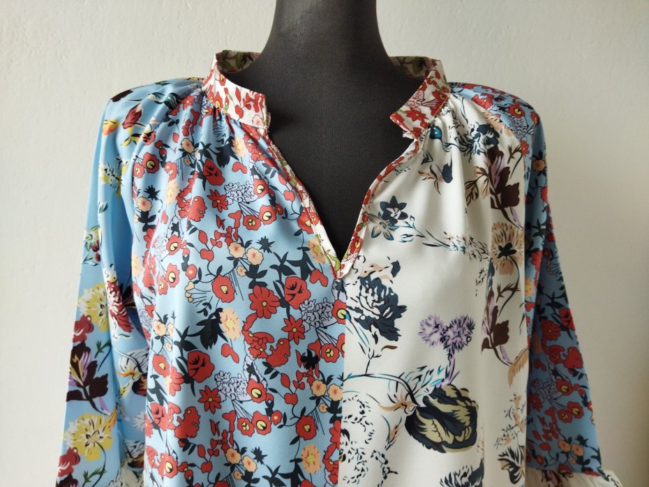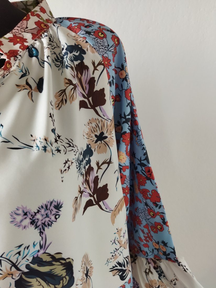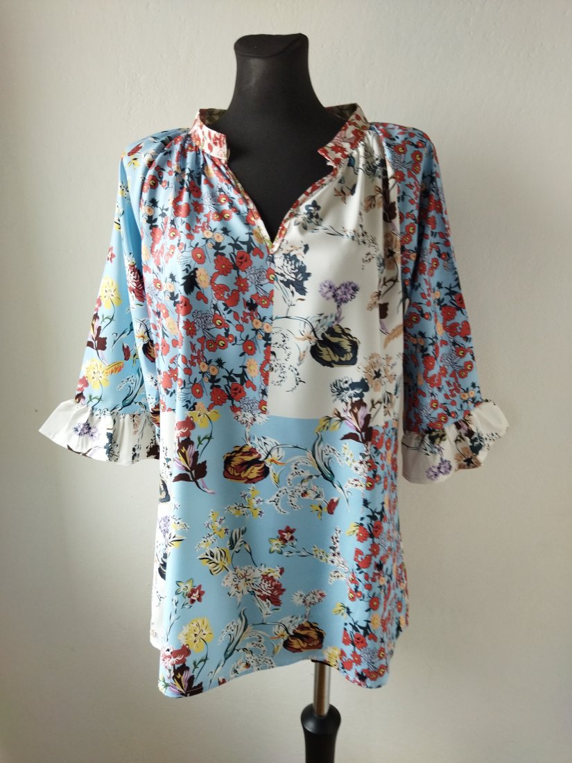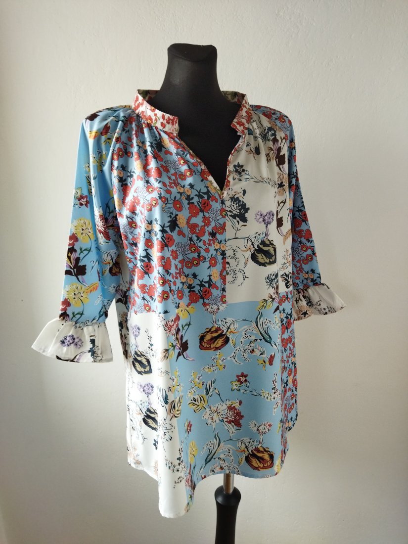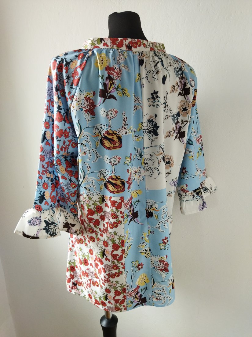 Wzorzysta bluzka w patchworkowe kwiatowe wzory w pastelowych kolorach. Dekolt w szpic, lekko przymarszczana od dekoltu, pod szyją stójka, raglanowe rękawy z falbanka.