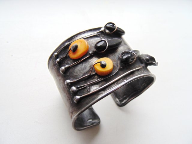 Bransoletka wykonana z miedzi, cyny, onyksów i koralowców. Szerokość ok. 4 cm. Obwód regulowany.