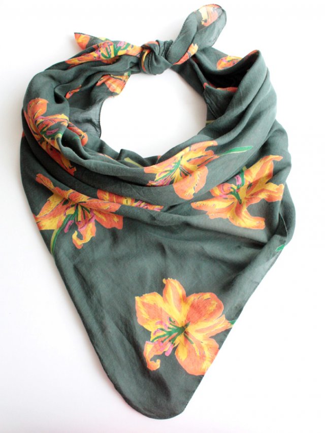 Oryginalna, kwiatowa chusta w ciemnym odcieniu zieleni, uszyta z wiskozy.