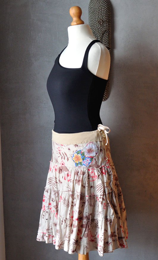 Wykonana z przewiewnej bawełny, na podszewce - także bawełnianej. Odcienie brązów, beżów, taupe i różu - w kwiatowy, hawajski print. Materiał wykończony na surowo (nitki odstają - taki ma urok!). Z przodu, na lewym biodrze kolorowa naszywka z hawajskimi kwiatami; z tyłu, na ściągaczu także naszywka z napisem L.G. HIGH.