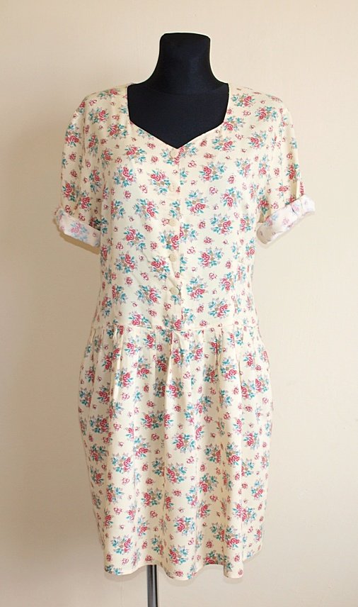 Bardzo dziewczęca sukienka marki PTA, prawdopodobnie z wiskozy, kwiatowe bukieciki na bardzo jasnym żółtym tle. Brak śladów użytkowania. Dół od bioder ułożony w zakładki, w szwach bocznych kieszenie do środka. Rozmiar z metki 38, ale fason jest luźny, więc będzie dobra także na większy rozmiar. Podaję wymiary mierzone na płasko;