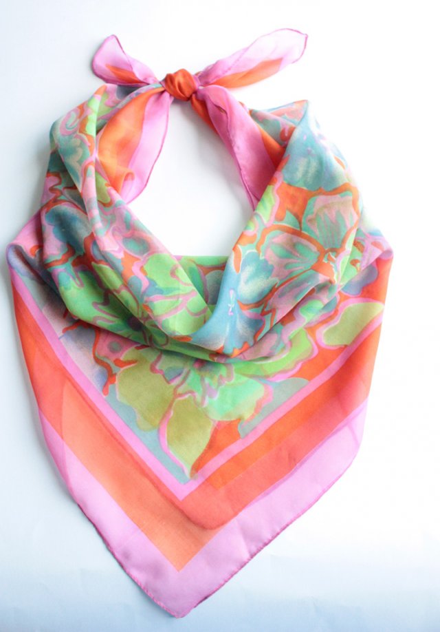 Kolorowa chusta w kwiatowe motywy. Materiał to prawdopodobnie poliester.