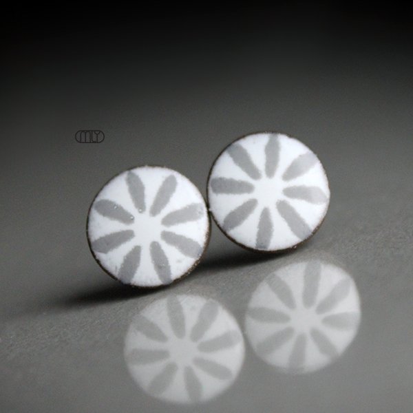 Ceramiczne okrągłe kolczyki, ręcznie wykonane z delikatnej gliny kamionkowej, jednostronnie szkliwione mieszanką szaro beżowych szkliw z efektem plamek, na antyalergicznych sztyftach w kolorze srebrnym. Średnica ok. 11mm. Polecam . Termin realizacji zamówienia to 1-2 dni.