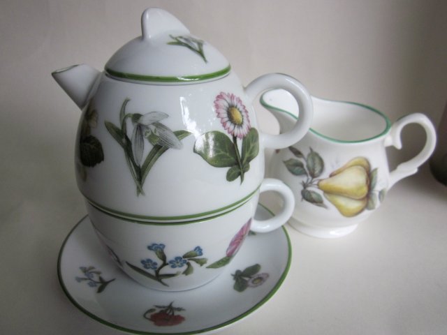 Fantastyczny zestaw - komplet porcelanowy. Imbryczek do zaparzania i filiżanka ze spodkiem. Ciekawa forma imbryczka, wygodne ucho. Fantazyjny uchwyt przykrywki Przykrywka z rantem i języczkiem zabezpieczającym przed spadaniem. Spora filiżanka z wygodnym uchem. Mocna, solidna porcelana i absolutnie urocze kwiatowe zdobienie w żywych barwach. wykończenie satynowo błyszczące. Wzór lekko wyczuwalny pod dłonią w wykończeniu satynowym. Ranty zielenią podkreślone. Sygnatura. Spodek - góra trochę ponad 12 cm dół 8,5 wys. nie całe 2 cm Filiżanka - szerokość 11 cm góra 8,5 cm dół 5 cm wysokość trochę ponad 5 cm Imbryczek - szerokość prawie 12 cm pękatość prawie 9 cm dół trochę więcej niż 7,5 cm góra 5,5 otwór 4 cm wysokość około 7,5 cm Wysokość całego zestawu około 15 cm Stan zachowania bardzo dobry.