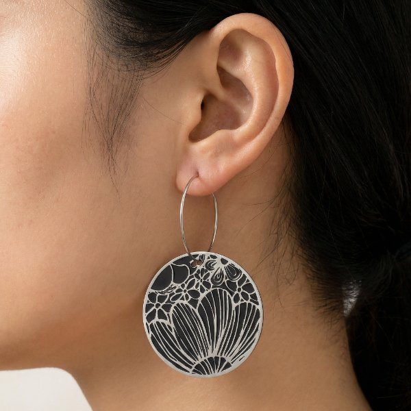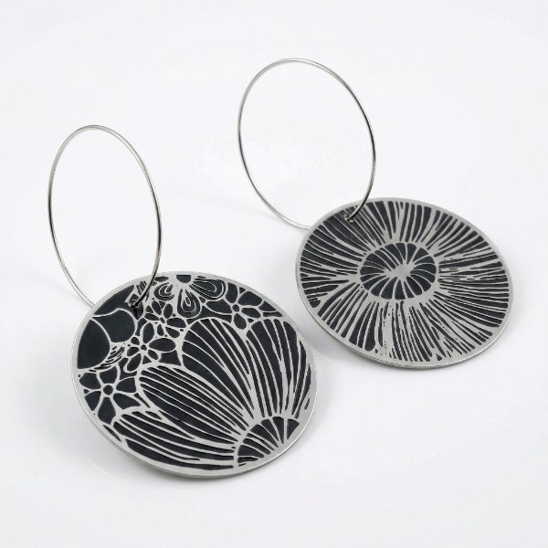 Duże wiszące kolczyki koła z motywem roślinnym wykonanym według autorskiej grafiki. Wykonane z emaliowanej stali nierdzewnej oraz srebra próby 0,925 (bigiel). Lekkie i połyskujące na słońcu, kolczyki koła są cały czas w ruchu. Długie na 5 cm. Koło z motywem roślinnym ma średnicę 3 cm.