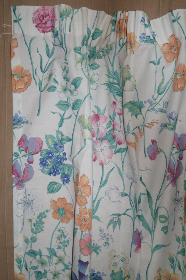 Piękne, romantyczne zasłony wyprodukowane w Wielkiej Brytanii, pastelowe kolory, na białym tle motyw polnych kwiatów, świetnej jakości materiał: 50% bawełna, 50% poliester, lekko sztywne ale jednocześnie ładnie się układają, świetnie się prezentują w oknie kuchennym albo w sypialni, są już gotowe do powieszenia, z wszytą taśmą do marszczenia