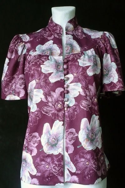 Bluzka vintage w kwiatowy wzór. Zapinana na środku na okrągłe guziczki [tylko na środku].Duży karczek z przodu i z tyłu.Stójka i rozszerzane rękawy.Zapasowy guzik.Kolor-fioletowo-brązowy.