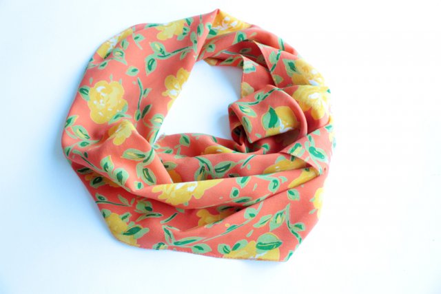 Kwiatowy szal w pięknym, pomarańczowym kolorze. Jest to prawdopodobnie jedwab naturalny lub syntetyczny