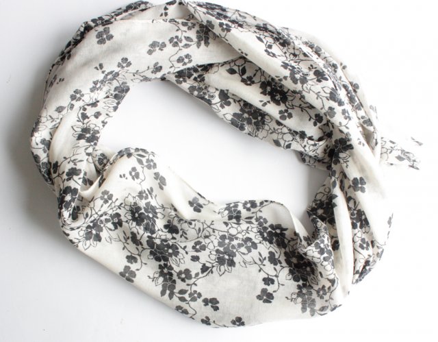 Czarno-biały szal o luźnych splotach w kwiatowe wzory. Materiał to prawdopodbnie bawełna lub wiskoza.