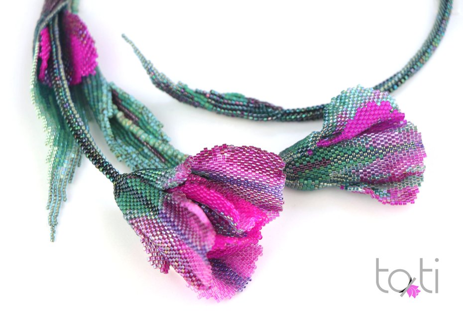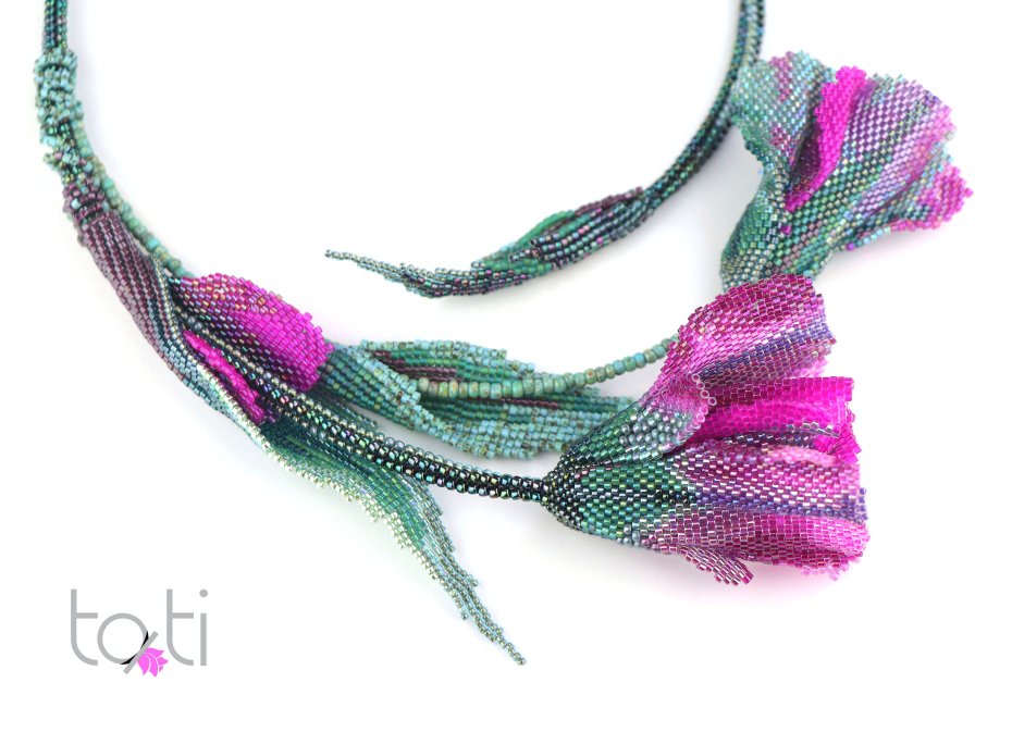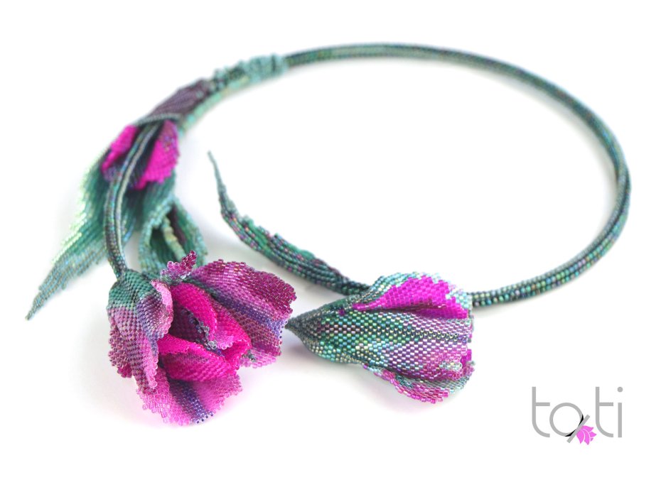 Tulipany słyną ze swojego piękna i elegancji, nic więc dziwnego, że stały się symbolem kobiecości i wyrafinowania. Wybrałam kontrastowe połączenie kolorów - turkusu i fuksji z nutami różu i fioletu. Jasność i bogactwo fuksji nadają naszyjnikowi energii i ekstrawagancji. Ten naszyjnik jest przeznaczony dla odważnych, aktywnych kobiet, które nie boją się wyróżniać.