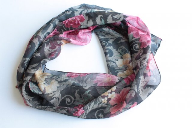 Zwiewny szal w kwiatowe wzory. Wykonany prawdopodobnie z poliestru.