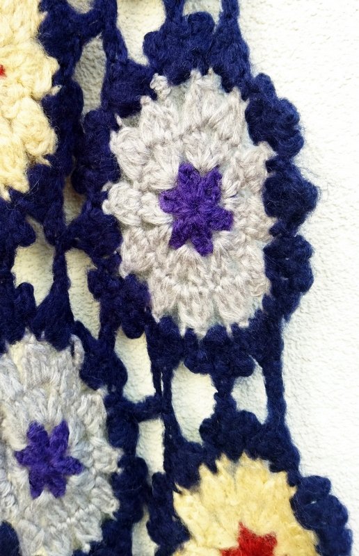 Cudny szydełkowy szal z łączonych kwiatowych elementów w budyniowym , jasnoszarym i rudym kolorze na granatowym tle.