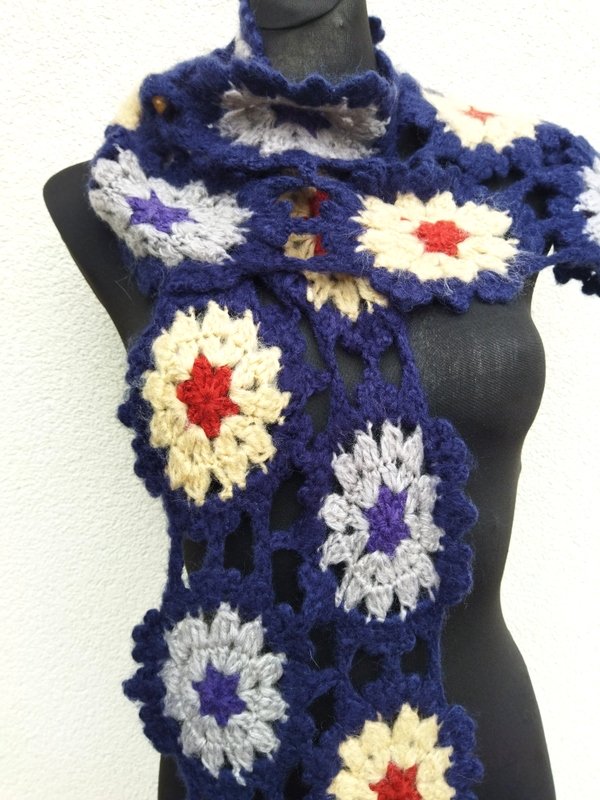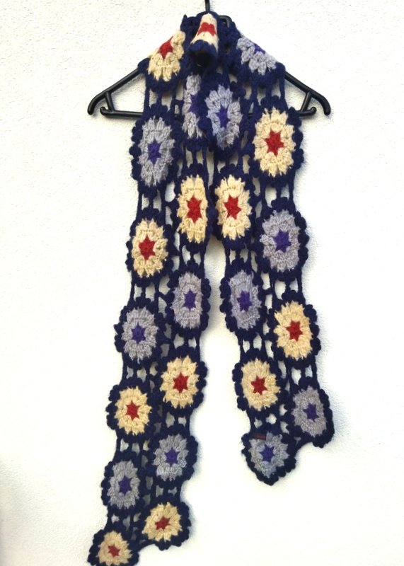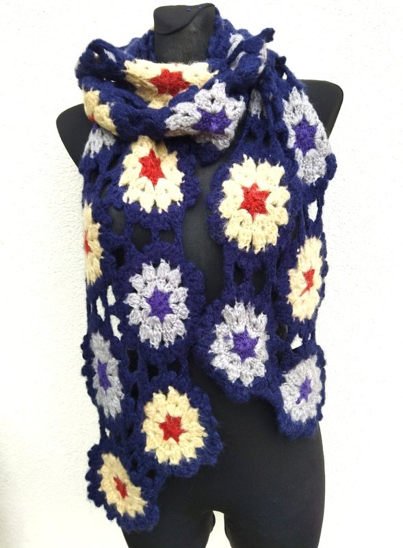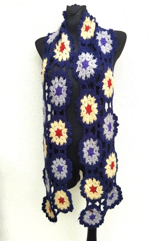 Cudny szydełkowy szal z łączonych kwiatowych elementów w budyniowym , jasnoszarym i rudym kolorze na granatowym tle.
