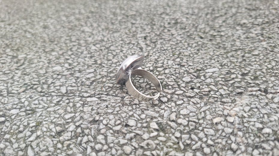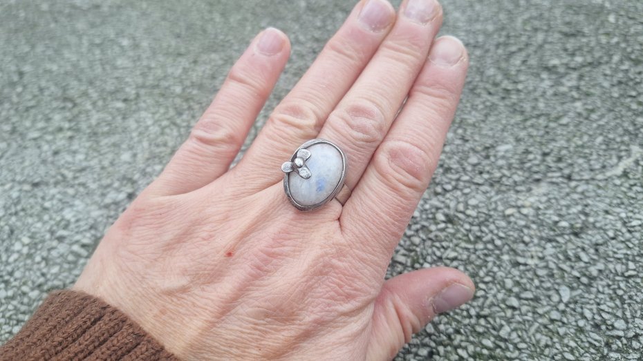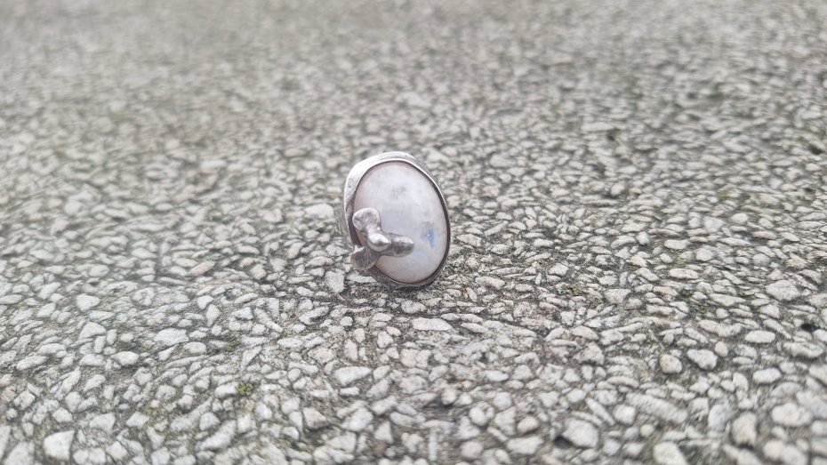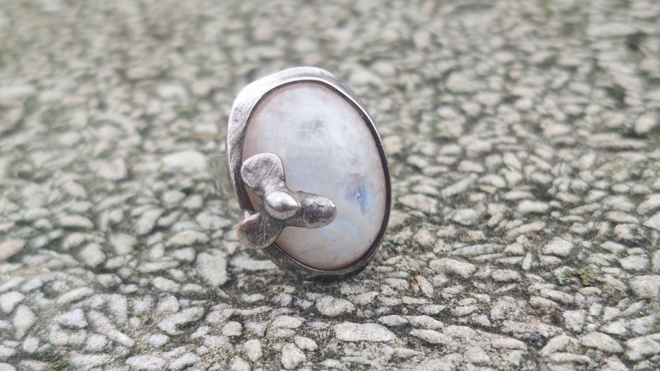 Pierścionek wykonany z miedzi, cyny i naturalnego kamienia księżycowego. Wymiary ok. 2 na 1.5 cm. Regulowany. Nie jest ciężki.