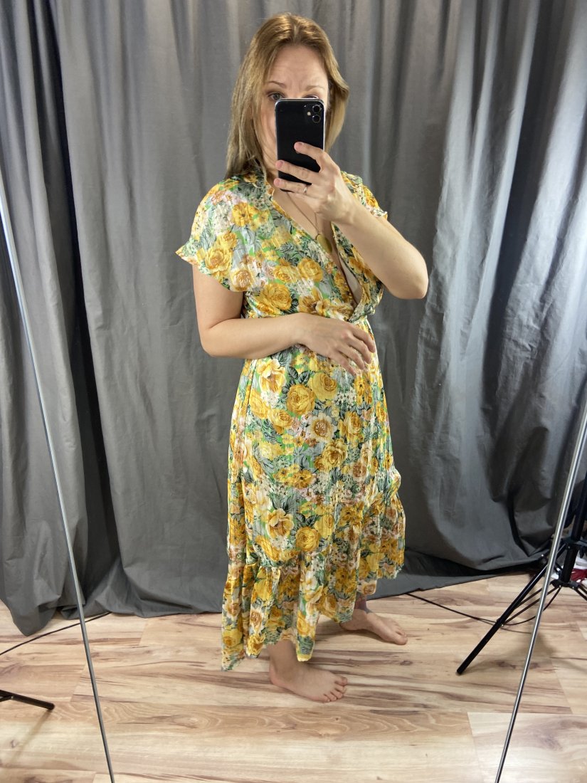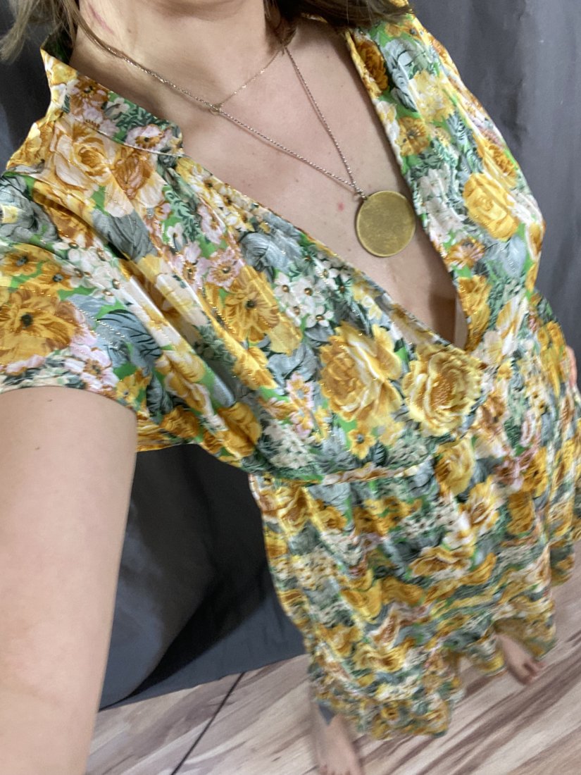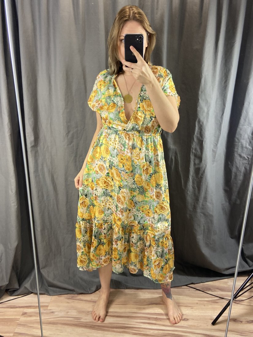 Śliczna kwiecista sukienka. Wierzch transparenty, na przemiłej elastycznej podszewce. Przeszyta złotą nicią.