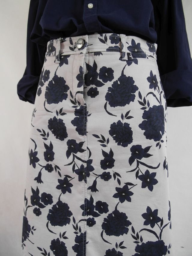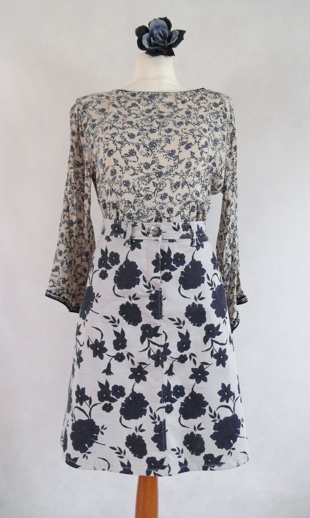 Tagi: #beż granat, #jeansowa w kwiaty, #kontrastowy wzór, #kwiatowa spódnica