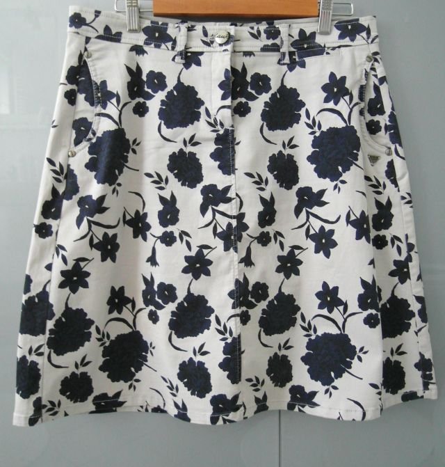 Kolor jasny beż (odcień lniany) i na nim kwiaty ciemno granatowe. fason spódnicy jeansowej - z przodu suwak i guzik, dwie kieszenie na bokach, jedna mini przy pasie. Z tyłu jedna udawana kieszeń. Bardzo wygodna i elastyczna.stan jak nowa.