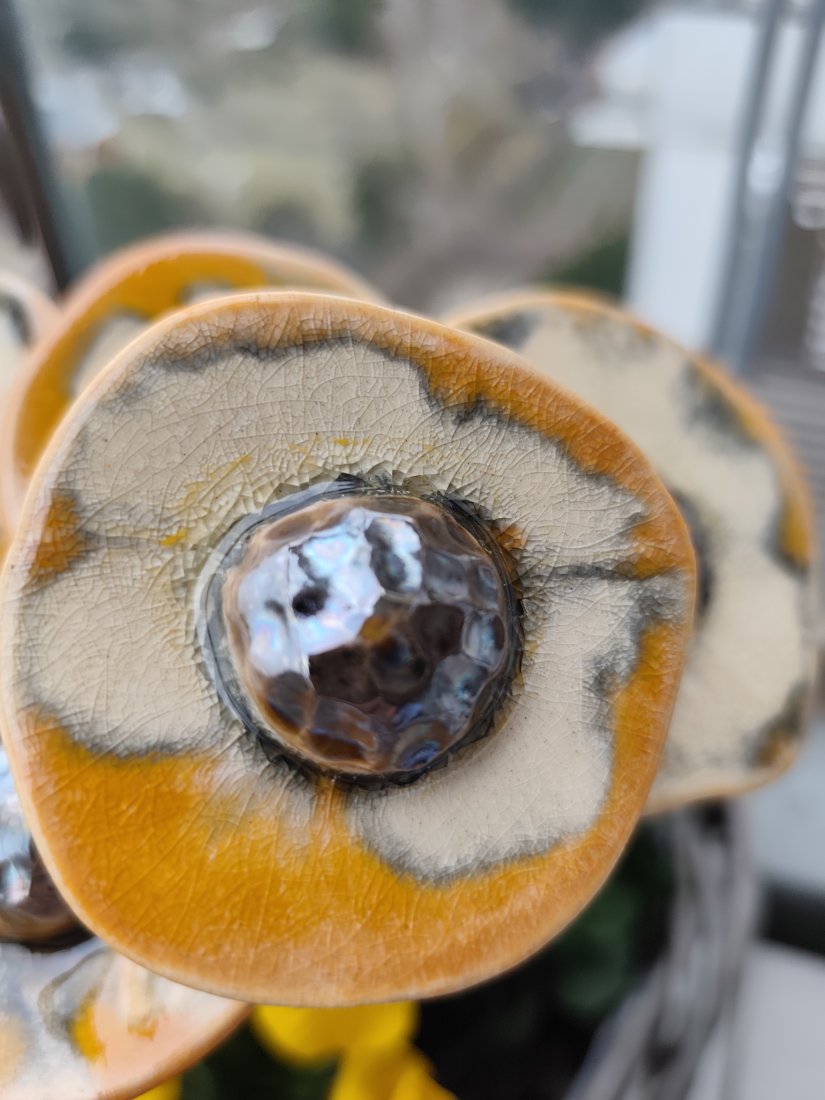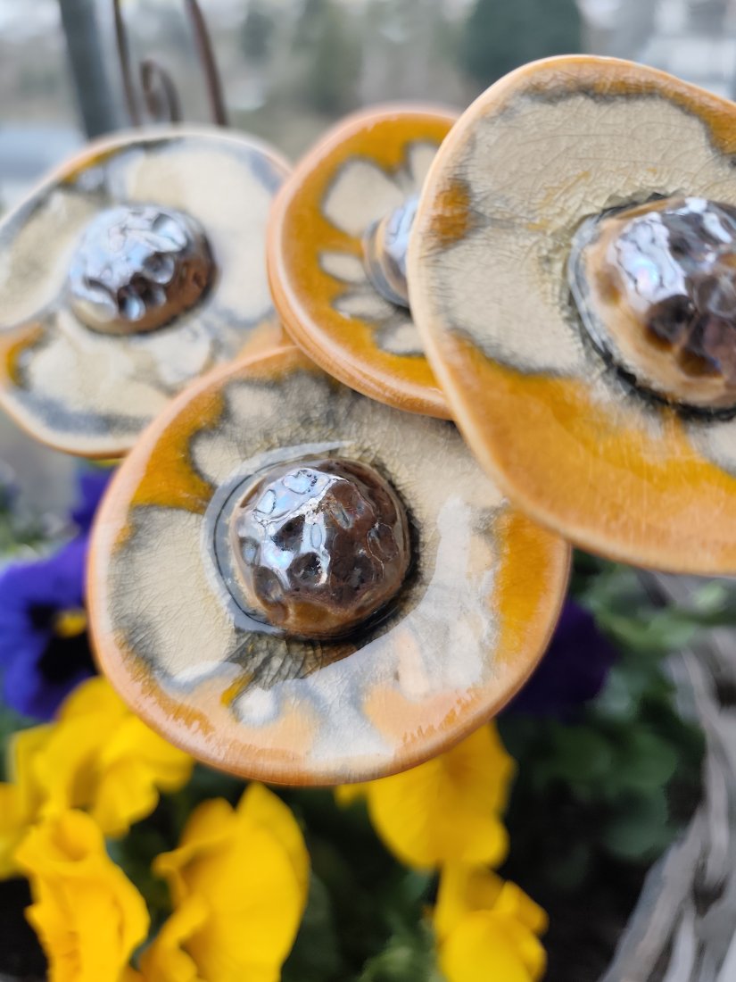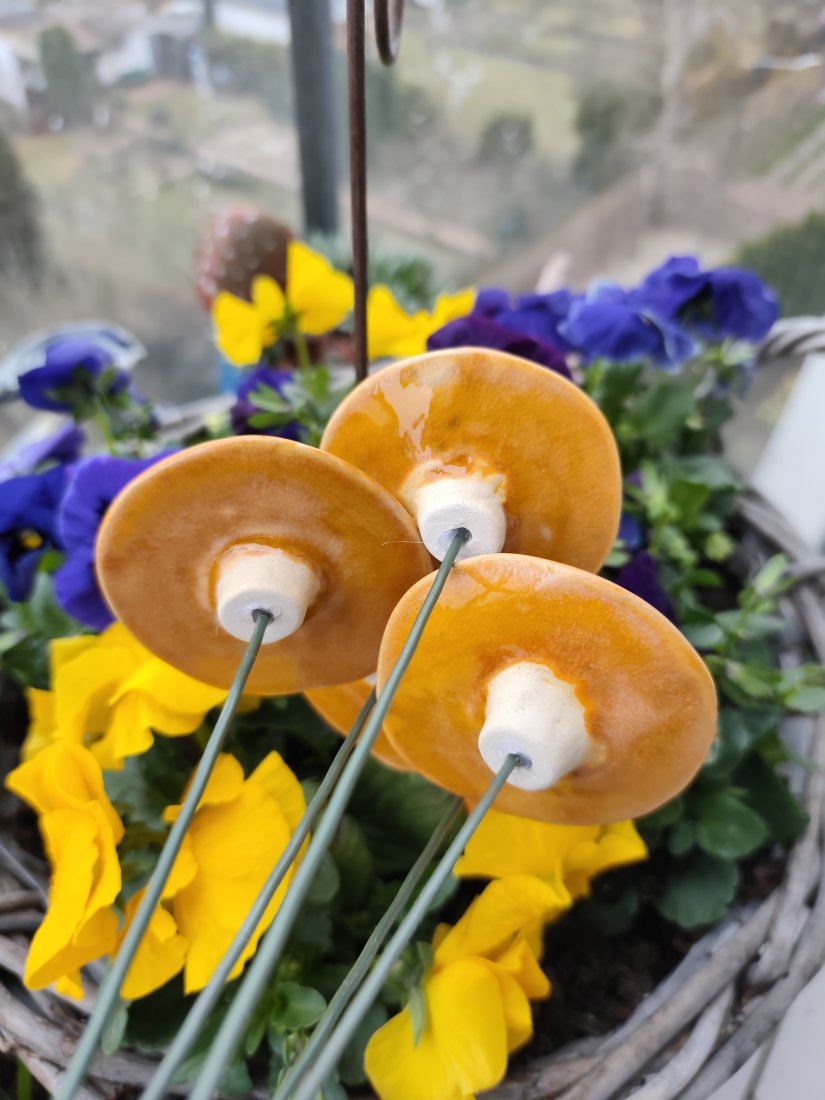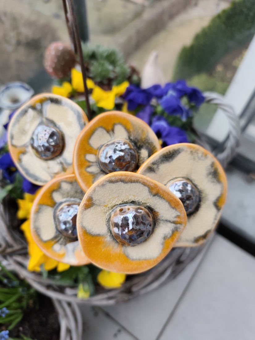 Kwiaty ceramiczne 5 szt. zamontowane na druciku florystycznym długości 40 cm. Wykonane ręcznie, szkliwione i dwukrotnie wypalane w piecu ceramicznym w temperaturze 1050 stopni. Polecam pięknie wyglądają w donicy.