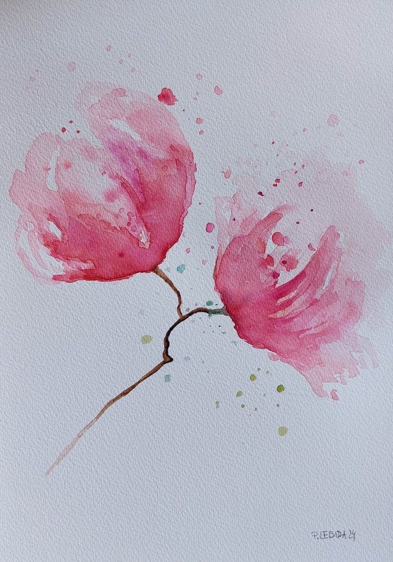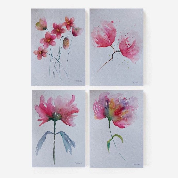 Cztery oryginalne akwarele, wykonane farbami akwarelowymi firmy Sennelier na papierze akwarelowym 300g firmy Fabriano.