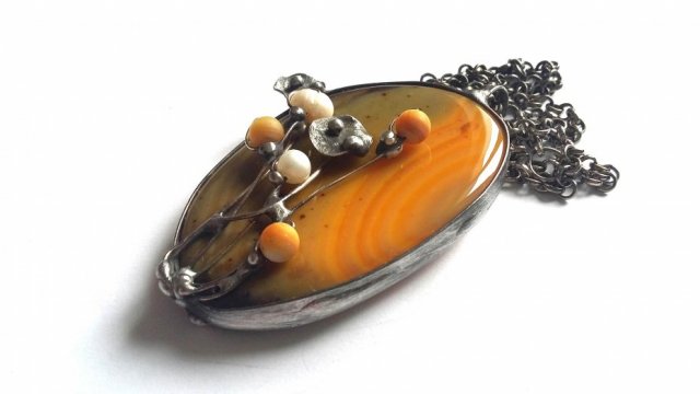 Wisiorek wykonany z miedzi, cyny, agatu, muszli i pereł. Wymiary ok. 6 na 4 cm. Łańcuszek o długości ok. 45 cm.