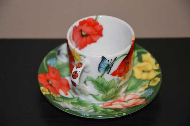 Włoska mała filiżanka ze spodkiem , sygnowana.Zdobiona kwiatami i motylami.