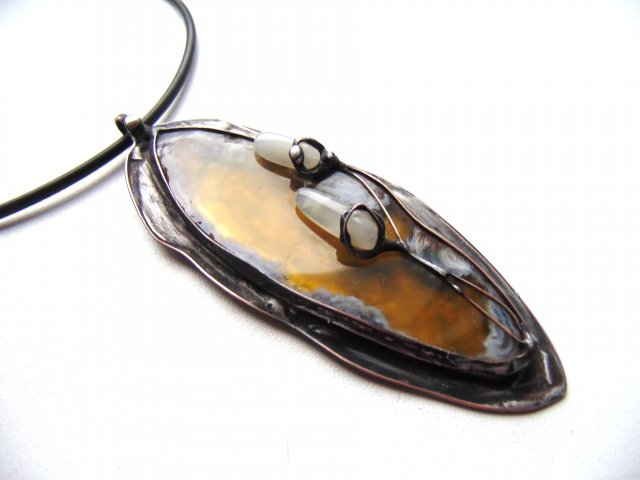 Wisiorek wykonany z miedzi, cyny, agatu i kamieni księżycowych. Zawieszony na czarnej lince kauczukowej o długości ok. 45 cm. Wymiary ok. 10 na 4 cm.