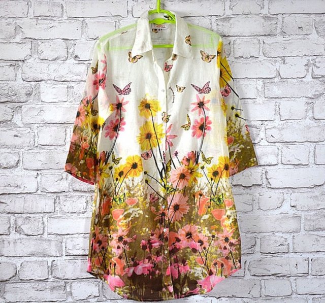 Piękna długa koszula wykonana z wysokiej jakości cieńszej bawełny w nadruki kawiatów na łące, zapinana na guziczki, pod szyją kołnierzyk, fason poszerzany do dołu. Rękawek długości midi za łokieć.