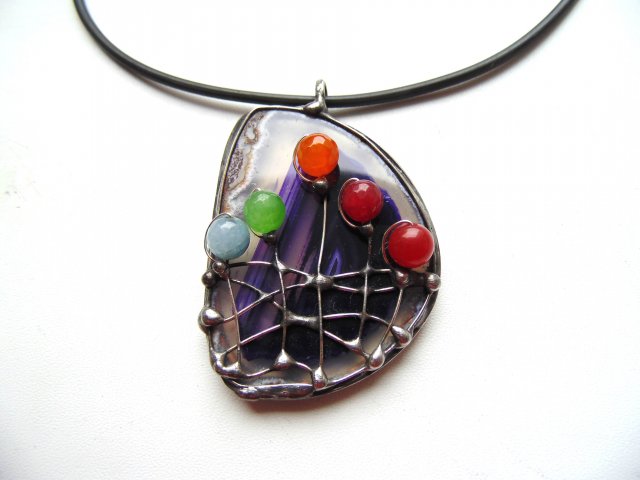 Wisiorek wykonany z miedzi, cyny, agatu i jadeitów. Zawieszony na czarnej lince kauczukowej o długości ok. 45 cm. Wymiary ok. 6 na 4,5 cm.