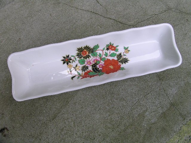 Przyjemnie dzwięczące,choć nie sygnowane Porcelanowe Naczynie o ciekawym prostokątnym kształcie. Kuchenne,łazienkowe,biurskowe zastosowanie znależć może...Na ciepłej bieli porcelanwy na błyszcząco szkliwionej...oreintalne w kolorach i wyrazie kwiaty. Wzór satynowy,lekko jakby wystający spod szkliwa. Rant bardzo delikatnie ryflowany.