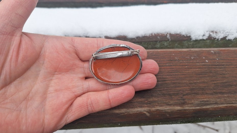 Broszka wykonana z miedzi, cyny, jaspisu i szkła . Wymiary ok. 4.5 na 3.5 m. Zapięcie metalowe.
