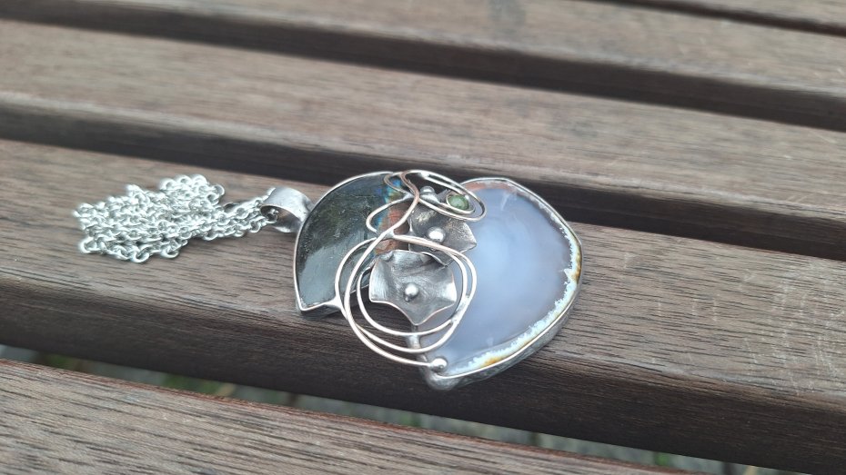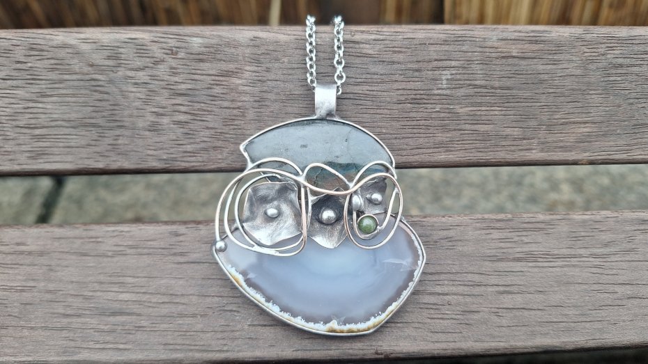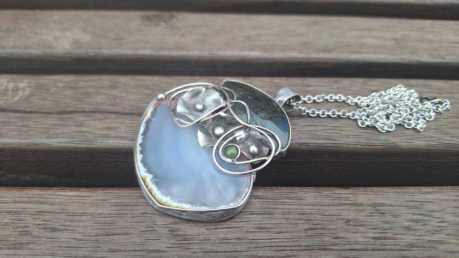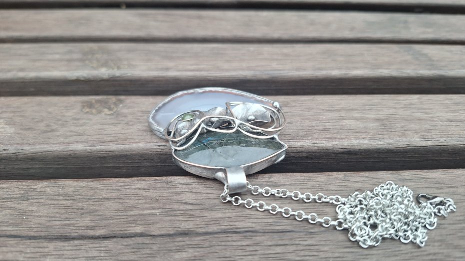 Wisiorek wykonany z miedzi, cyny, labradorytu, małej kulki turmalinu i naturalnego agatu. Wymiary ok. 6 na 5.5 cm. Zawieszony na łańcuszku o długości ok. 50 cm.