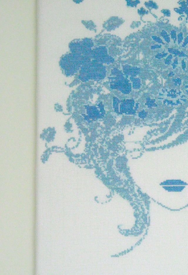 Biała kanwa (obciągnięta na ramie) i niebiesko błękitne kolory. Widzę go np. w salonie fryzjerskim :-) Bardzo polecam.