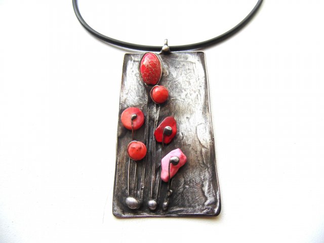 Wisiorek wykonany z miedzi, cyny, howlitów, jadeitów i koralowców. Zawieszony na czarnej lince kauczukowej o długości ok. 45 cm. Wymiary ok. 7,5 na 4 cm.