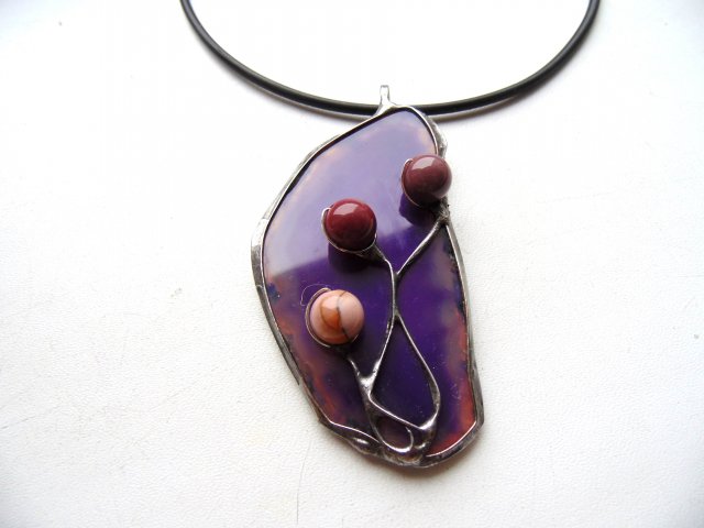 Wisiorek wykonany z miedzi, cyny, jaspisów i agatu. Zawieszony na czarnej lince kauczukowej o długości ok. 45 cm. Wymiary ok. 7,5 na 4 cm.