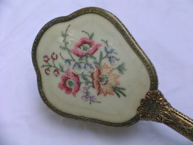Duże stylowa i romantyczna szczotka, z mosiężnym, bogato dekorowanym uchwytem i kwiatową dekoracją bukietową w żywych barwach ręcznie wyszywaną. Charakterystyczna patyna czasu na rączce. Elegancja z dawnych lat. 29 x 5 x 5 cm. Stan zachowania dobry plus :)