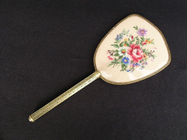 Duże stylowe i romantyczne lusterko z fazą, mosiężnym dekorowanym uchwytem i kwiatową dekoracją bukietową w żywych barwach ręcznie wyszywaną. Elegancja z dawnych lat. 30 x 12,5 cm. Tafla lustra z kilkoma zarysowaniami, poza tym stan zachowania dobry plus.