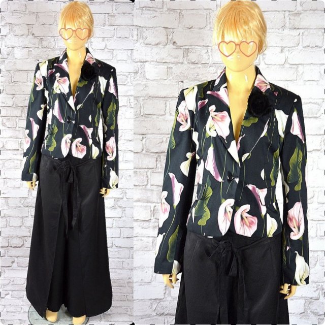 Elegnacka , efektowna marynarka/żakiet marki Occo w kalie na czarnym tle, fason delikatnie taliowana,przód minimalnie dłuższy od tyłu, zapinana na guzik, w ramionach lekkie poduszki, po bokach patki jako imitacje kieszonek,dodatkową ozdobą żakietu jest sporej wielkości broszka z naturalnego królika przyszyta przy kołnierzu. Całość na podszewce.Polecamy- bardzo efektowanie się prezentuje.