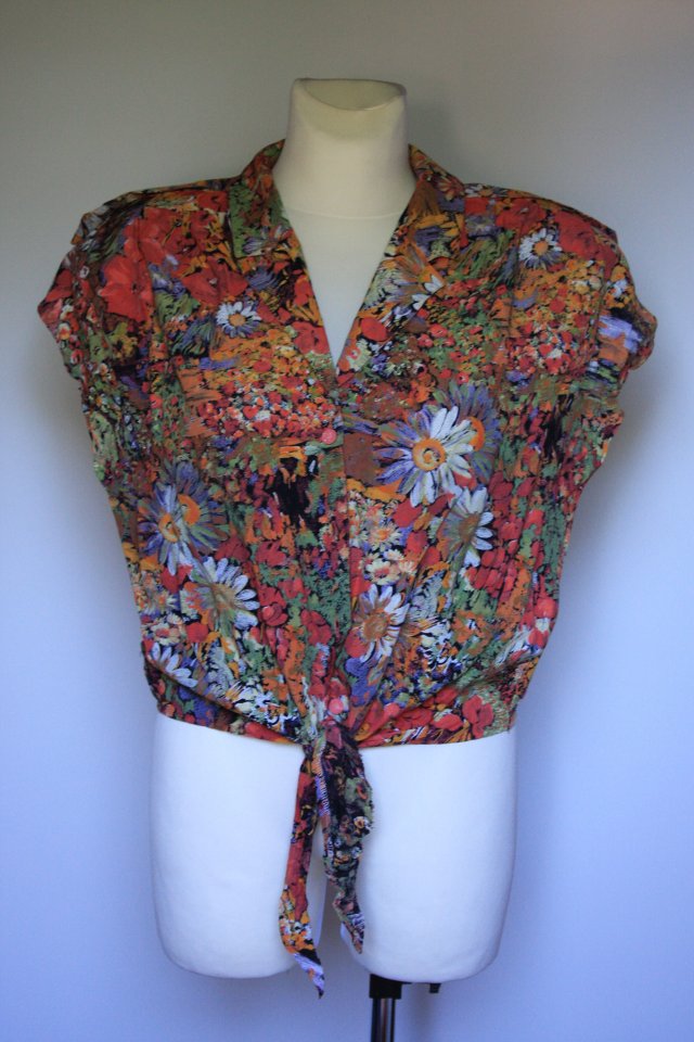 krótka kwiecista luźna bluzka vintage w jesiennych barwach, wiązana u dołu, zapinana na guziki, w ramionach duże poduszki, z kołnierzykiem
