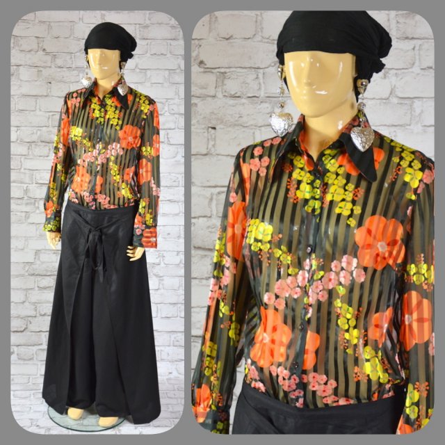 Zjawiskowa bardzo kobieca bluzka z kołnierzykiem zapinana na guziczki, bluzka wykonana z delikatnej nieelastycznej tkaniny, tkanina subtelnie przeźroczysta w pionowe czarne pasy w towarzystwie kolorowych kwiatów (pomarańczowych, limonkowych, jasno różowych . Przy mankietach zapinana na guziczki.
