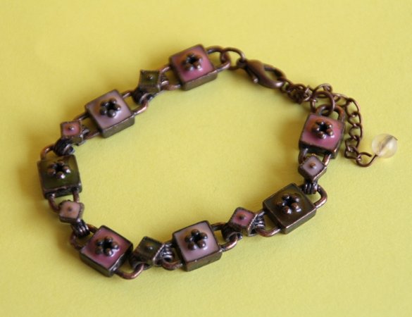 Przeurocza bransoletka vintage z malutkimi kwiatkami. Solidnie wykonana z metalowych elementów w kolorze miedzi/czernionej miedzi. długość: 17 cm + 5 cm łańcuszka przedłużającego.