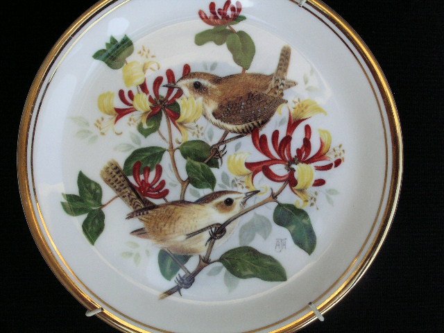 Pięknie zdobiony talerzyk porcelanowy, sygnowany Edwardian, z serii Birds of the Hedgerow. Jedwabiście błyszczące szkliwienie, dwu-pierścienne złocenie rantu i ta urzekająca malatura ptasiej pary w kwitnącym wiciokrzewiu :) Jakość wykonania. Z tyłu profesjonalny uchwyt do powieszenia. Użytkowy. 16,5 x 2 cm. Stan zachowania bardzo dobry. Wartość kolekcjonerska.