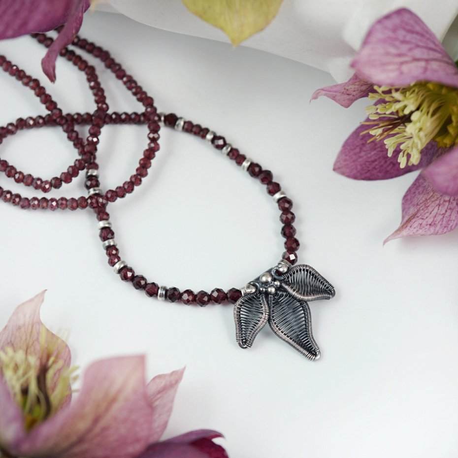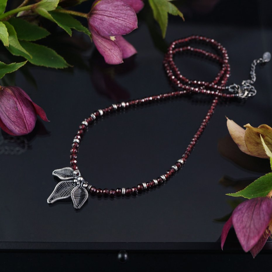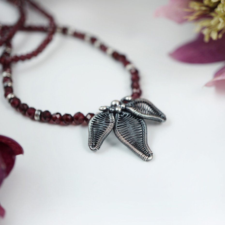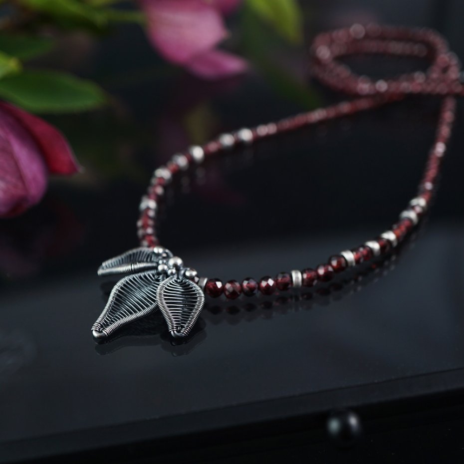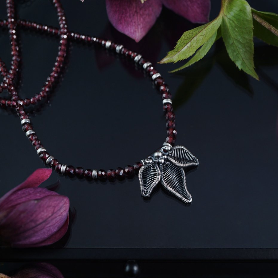Naszyjnik zaprojektowałam i wykonałam od podstaw, z wykorzystaniem pracochłonnej techniki wire wrapping oraz klasycznych technik jubilerskich. Stworzyłam go ze srebra próby 925 (przyciemnionego i polerowanego, miejscami przecieranego) oraz fasetowanych kuleczek granatu.