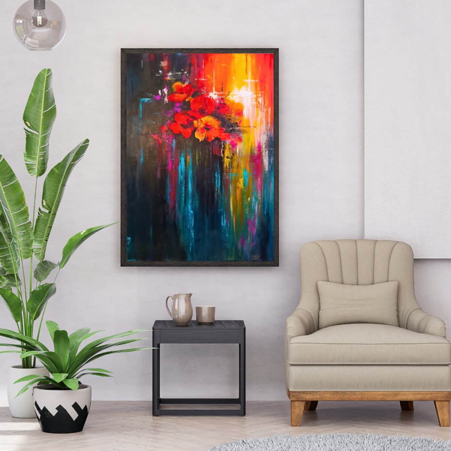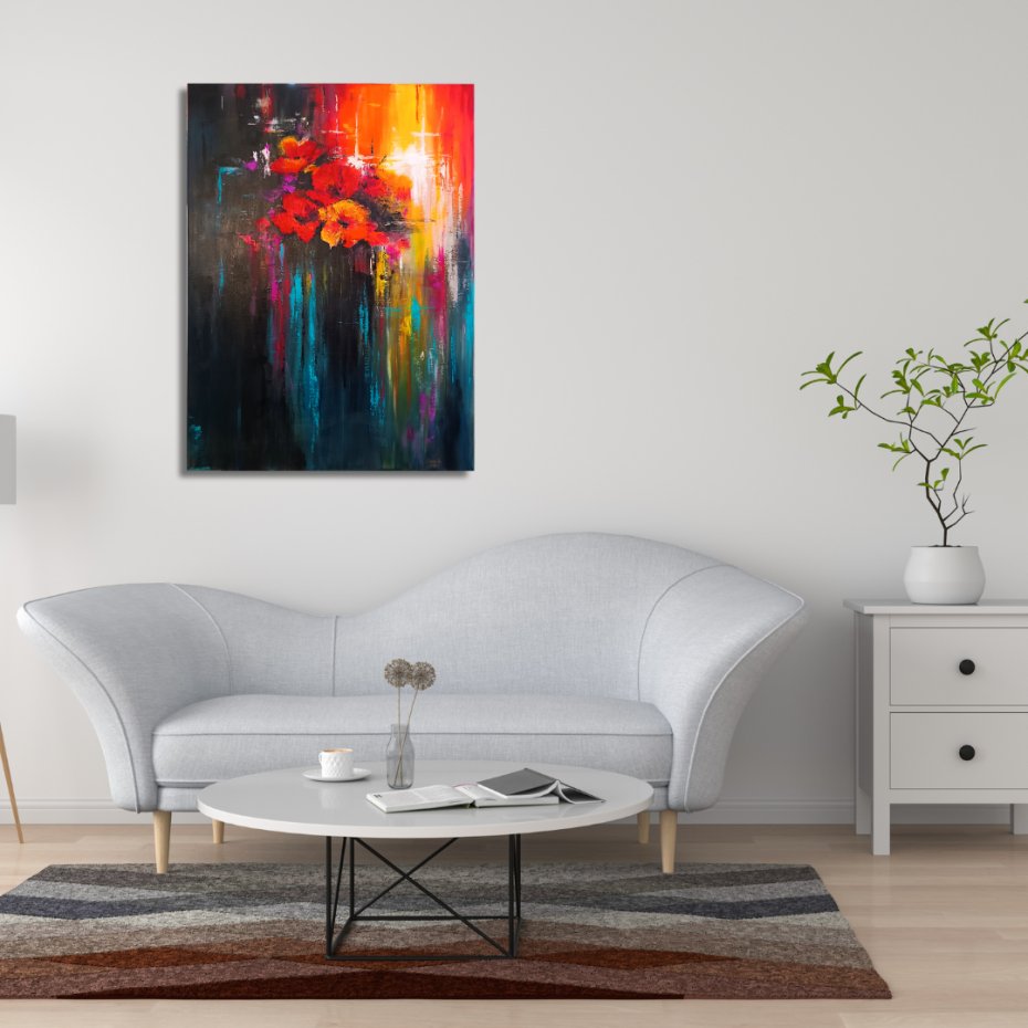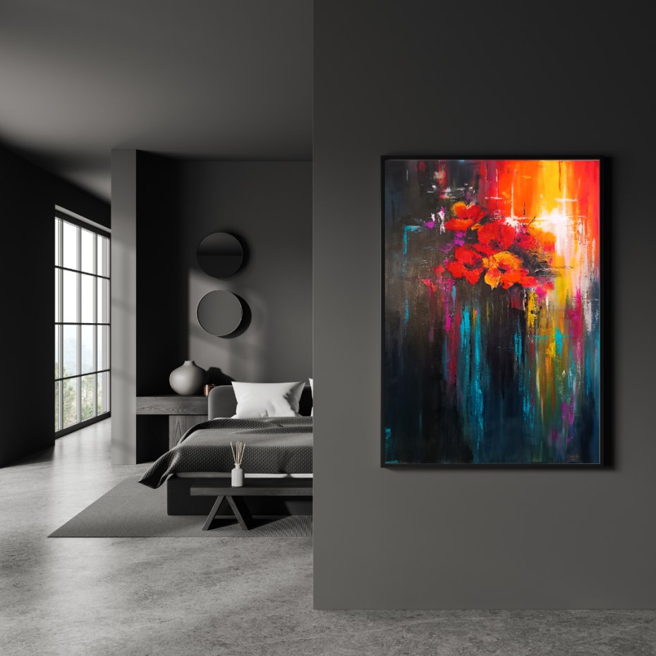 Przedstawiam wyjątkowy, ręcznie malowany obraz, który wniesie energię i nowoczesny charakter do każdego wnętrza. Ta dynamiczna kompozycja łączy w sobie intensywne barwy z delikatnością motywów florystycznych, tworząc niepowtarzalny efekt "eksplozji" kolorów.