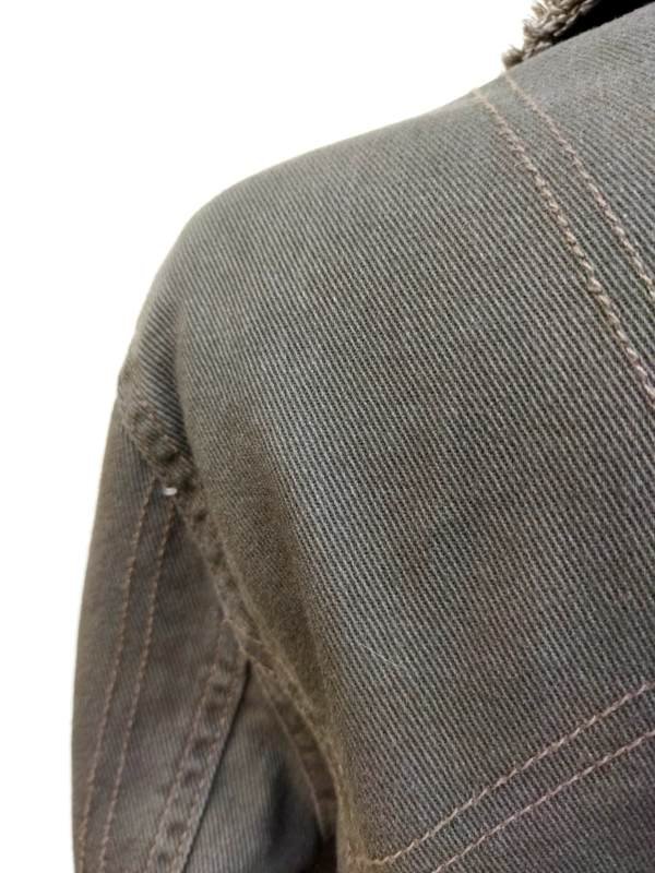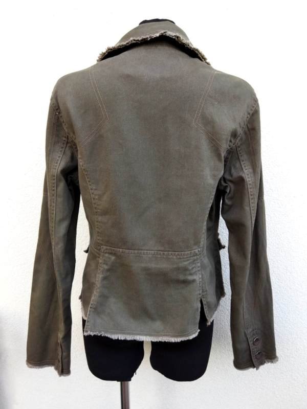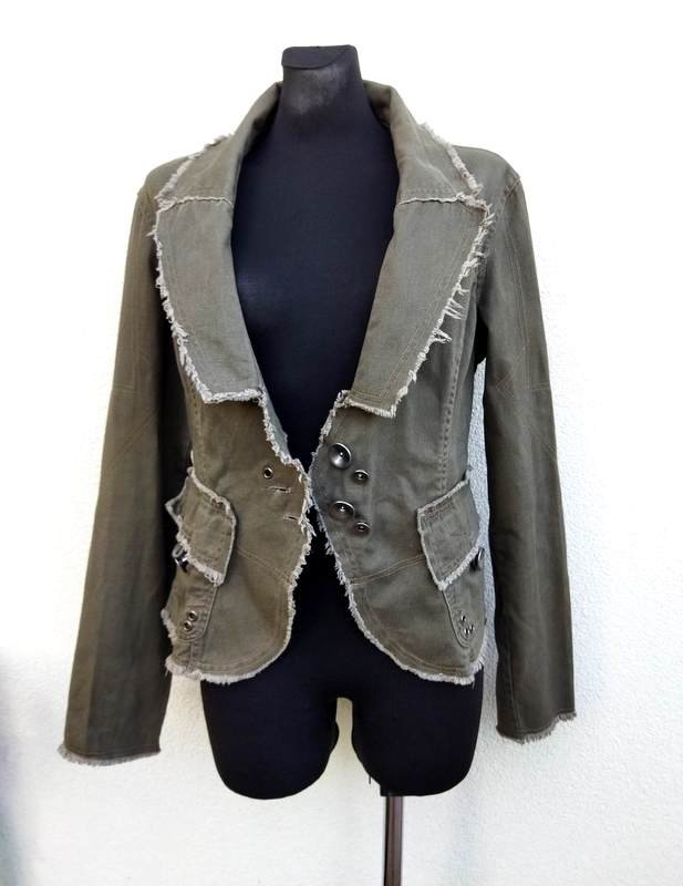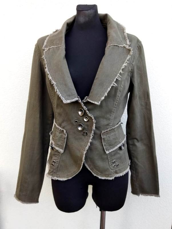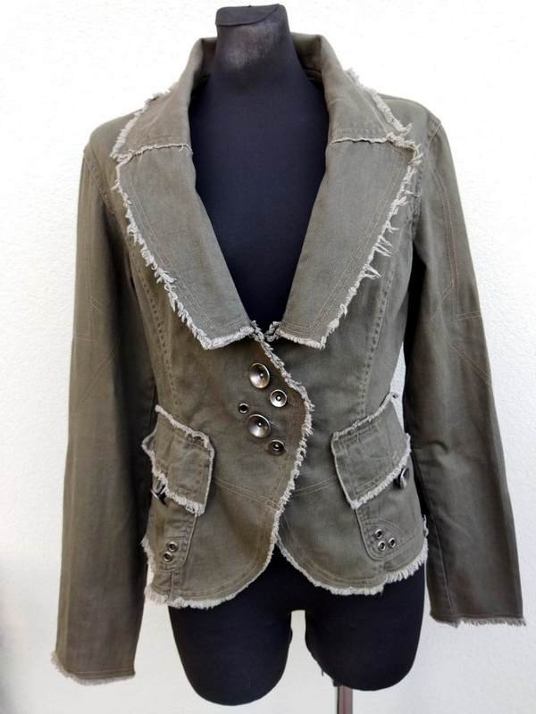 Zgrabna marynarka lub kurtka z bawełnianej tkaniny typu denim w kolorze rozwodnionej j zieleni, z wykończeniem na ,, surowo", z licznymi detalami . Taliowana, z kołnierzem z rewersami, z dwiema naszywanymi kieszeniami z patkami zapinanymi na guziki, rękawy u dołu zapinane na napy , poły przodu lekko zaokrąglone , Zapinana na ciekawe metalowe napowe guziki. Bez podszewki