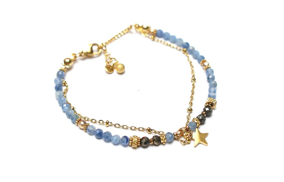 Delikatna bransoletka wykonana w całości ze stali szlachetnej pozłacanej, szlachetnych kamieni - kyanit fasetowany [3mm], piryt fasetowany [3mm], hematyt fasetowany, platerowany [3mm],przekładek z hematytu [1mm]. Całkowita długość bransoletki ok. 18,5cm. Biżuteria ozdobnie zapakowana.