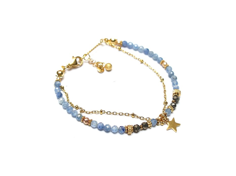 Delikatna bransoletka wykonana w całości ze stali szlachetnej pozłacanej, szlachetnych kamieni - kyanit fasetowany [3mm], piryt fasetowany [3mm], hematyt fasetowany, platerowany [3mm],przekładek z hematytu [1mm]. Całkowita długość bransoletki ok. 18,5cm. Biżuteria ozdobnie zapakowana.