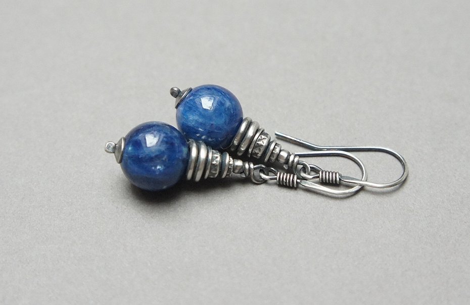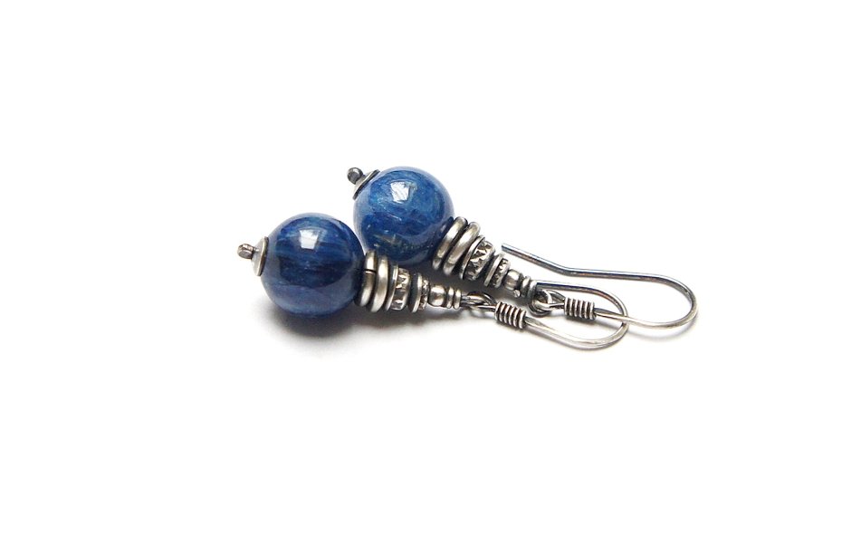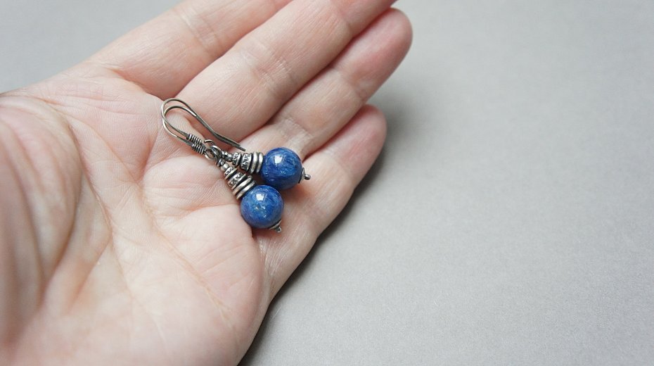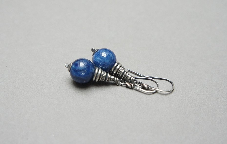 Kolczyki wykonane ze srebra [pr. 925] w połączeniu kuleczkami kyanitów [10mm]. Srebro oksydowane i przetarte. Całkowita długość kolczyków 4cm.