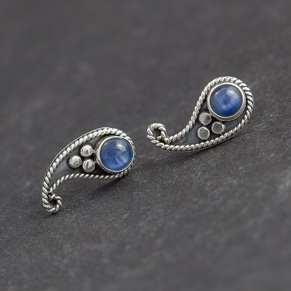 Kolczyki - sztyfty wykonane ze srebra próby 925 oraz kyanitu. Wielkość kamienia 5mm. Wielkość kolczyków 10x20mm. Kolczyki są ozdobnie zapakowane.