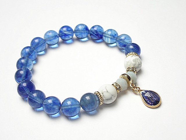 Bransoletka wykonana z naturalnych kamieni- kwarc [10mm], howlit matowy [10mm], kryształków fasetowanych [6 x 8 mm], efektownej zawieszki ze szkła oraz elementów metalowych w kolorze złotym. Bransoletka na gumce silikonowej. Pasuje na nadgarstek 16-17cm. Biżuteria ozdobnie zapakowana. Możliwość dopasowania bransoletki do nadgarstka - wcześniej prosimy o kontakt.