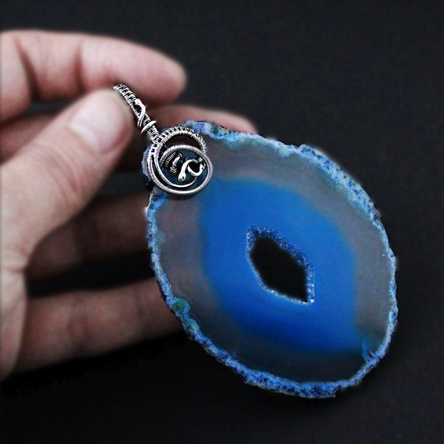Ten wisior z niebieskim agatem to nie tylko ozdoba – to talizman spokoju i wewnętrznej klarowności. Jego kolor dodaje lekkości i koi myśli, a naturalna forma podkreśla Twoją autentyczność. Amulet może stać się wyjątkowym prezentem lub ulubionym dodatkiem – zawsze przyciąga wzrok i niesie ze sobą historię natury zaklętą w kamieniu.